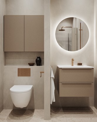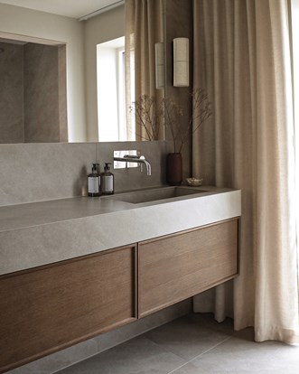 Ton-i-ton på badet handler om å bruke ulike nyanser av samme farge på vegger, gulv, møbler og metaller, som dusjvegger og blandebatterier. Dette gir badet et harmonisk og mykt uttrykk der alt henger sammen – et rom for ro og balanse. Her viser vi noen bad som kan inspirere deg som vil innrede ton-i-ton.