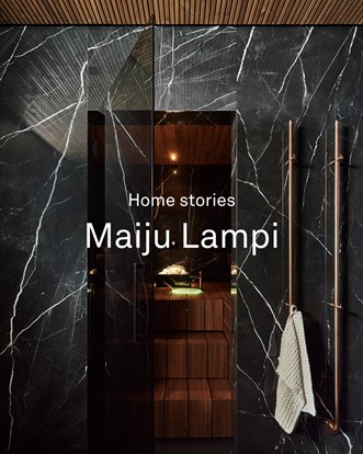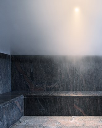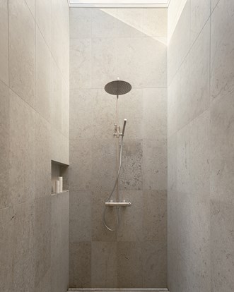 Bad innredet i gråtoner gir et rolig og stilrent uttrykk. Her møtes kalkstein, skifer og mikrosement med innslag av svartbeiset eik og rustfritt stål. Materialene skaper en balansert helhet med kontraster mellom varmt og kaldt, matt og blankt, lyst og mørkt.