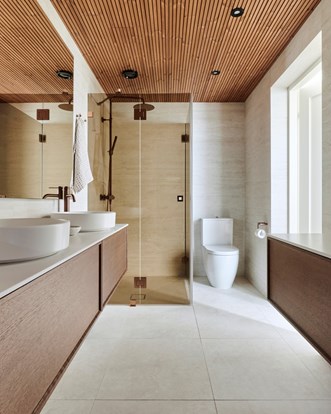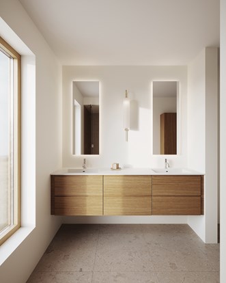 La deg inspirere av bad der skandinavisk enkelhet møter japansk balanse. Her smelter myke naturtoner, kalkstein og rene linjer sammen i et uttrykk som er både tidløst og naturnært. Lys og mørk eik gir varme og kontrast, mens hver detalj er valgt med omtanke. Resultatet er et rom som puster ro – et sted der form, funksjon og materialvalg lever i harmoni.