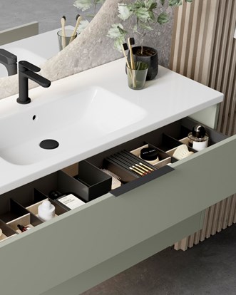 Den slette fronten på de innenforliggende skuffene skaper et moderne og symmetrisk uttrykk med rette linjer mellom skuffer og skrog. Grand Solid finnes i flere vakre, ekte finérer, i hvitt og i valgfri NCS. Velg mellom heldekkende servant i slitesterkt, blank porselen eller en matt porselenservant innfelt i benkeplate. Test ulike kombinasjoner i vårt studio og tilpass ditt eget møbel med push-open eller valgfritt grep, samt fine tilvalg på innsiden. Alle servantskap