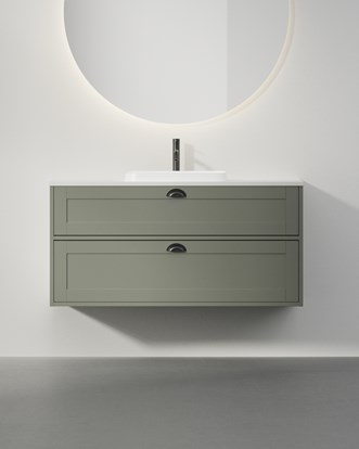 Her får du den klassiske rammefronten i en moderne skandinavisk stil, takket være de innenforliggende frontene. Grand Classic tilpasser du enkelt til din egen stil – romantisk i hvit med tidstypiske skålhåndtak og benkeplate med kalksteinsfølelse, eller en mørk NCS-farge du velger selv, kombinert med servant og benkeplate i svart og grått. Prøv deg fram med ulike kombinasjoner i studioet vårt. Alle servantskap