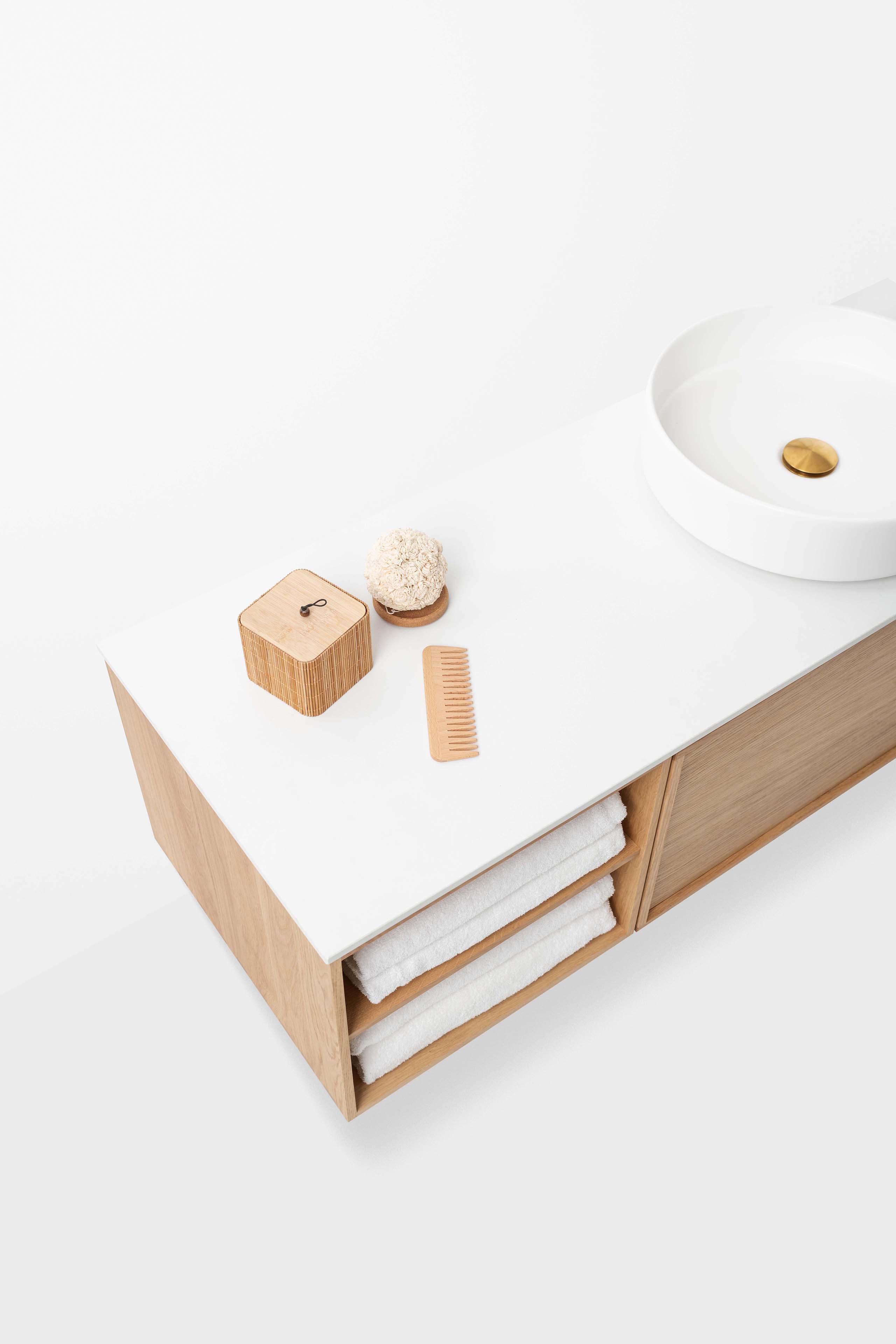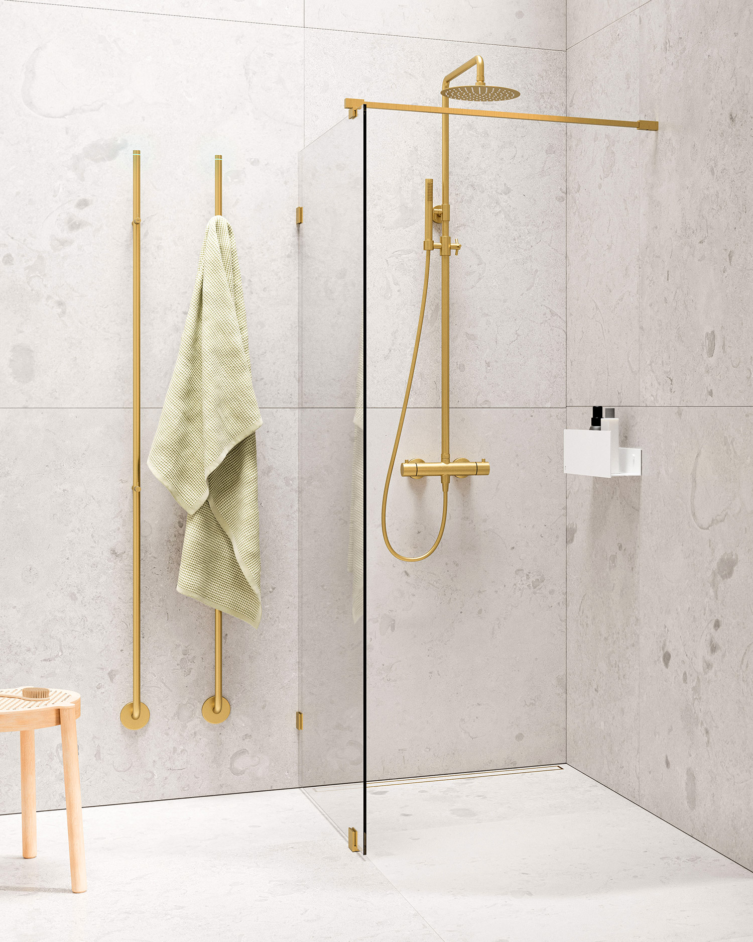 Brushed Brass gir badet en varm og elegant følelse med sin gylne, børstete overflate. Kombiner med marmor eller naturstein for et eksklusivt uttrykk, eller velg hvite og beige toner for å skape en luftig og lys atmosfære. Dype grønne eller blå nyanser kan gi en effektfull kontrast, mens eikefinér tilfører en naturlig og harmonisk balanse. Scroll ned for tips og inspirasjon.