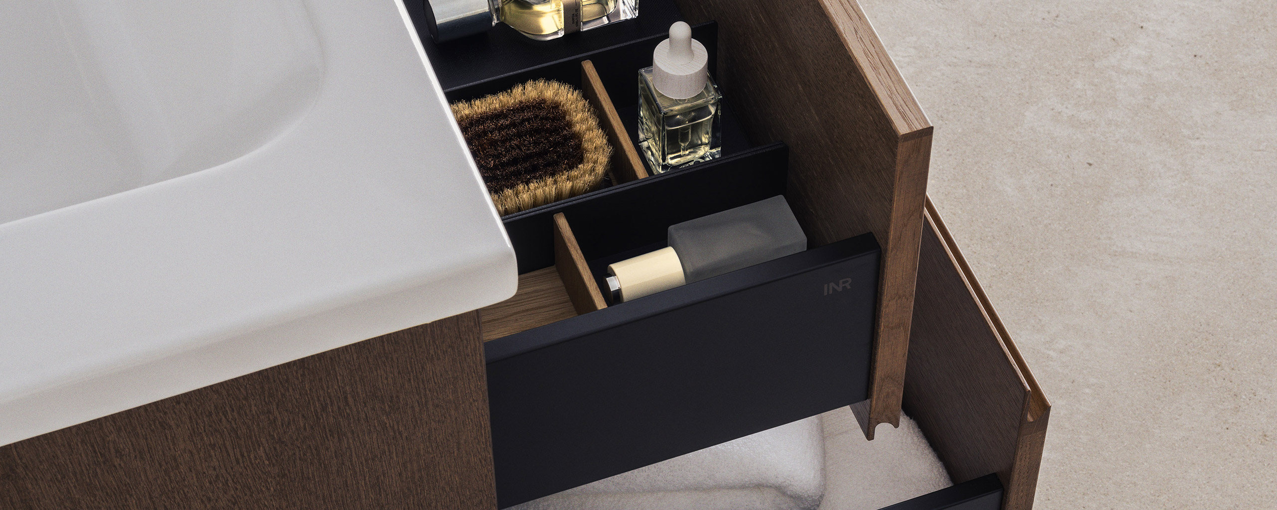 I serien finnes det matchende oppbevaring med mulighet for stikkontakt til for eksempel hårføneren. Høyskapene kan fås med eller uten skuffer. Helt nytt er høyskapet Twin med dobbelsidig speildør. Oppdag