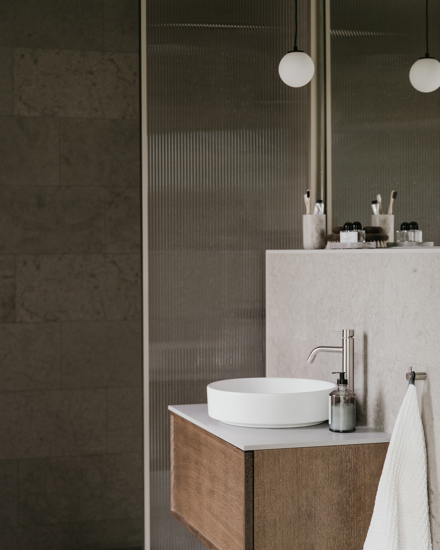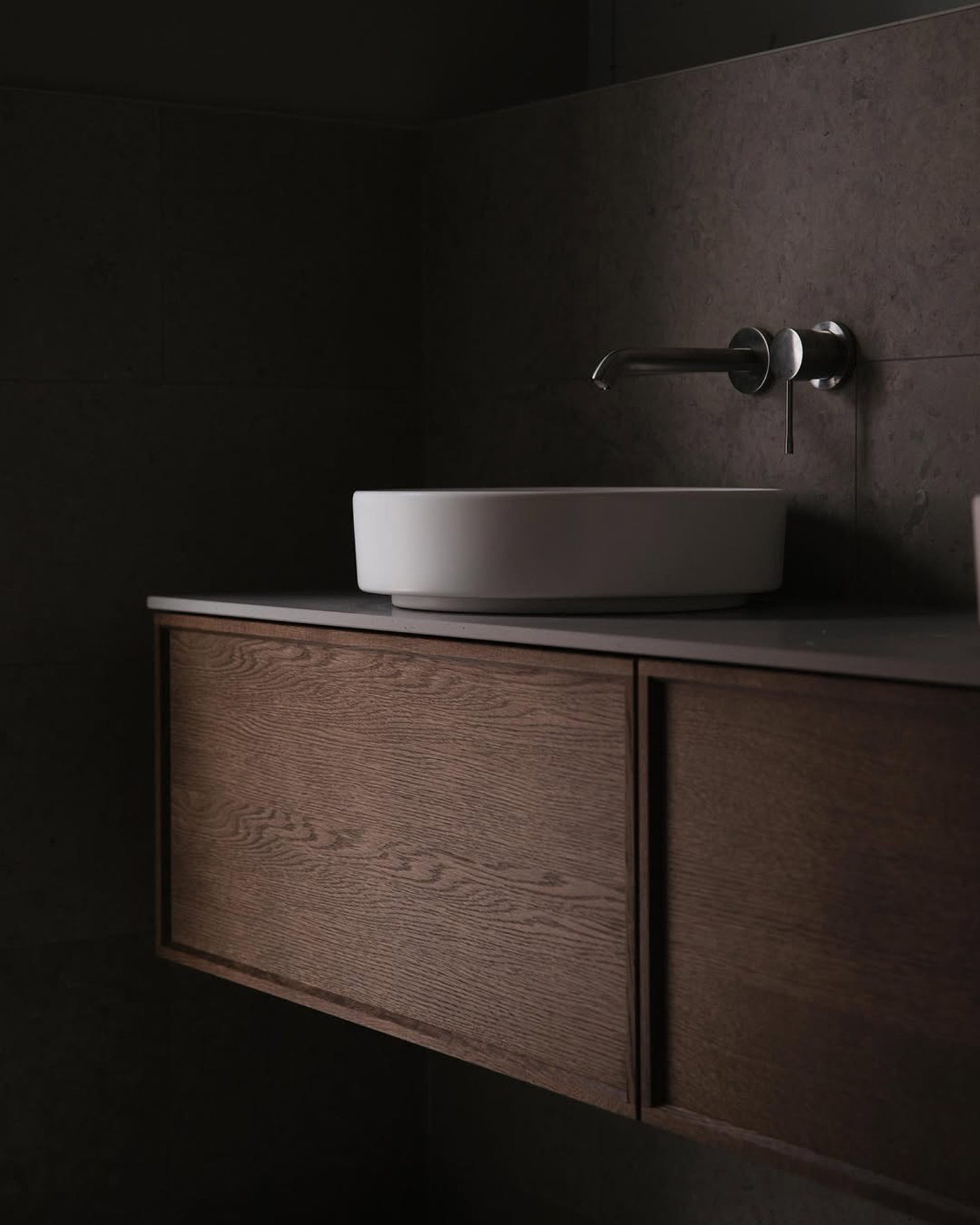 En sval palett av granittkeramikk med følelse av kalkstein fra Öland, røkfarget glass og mattsvart metall. For et rom der nordisk stillhet møter beroligende japanske undertoner.