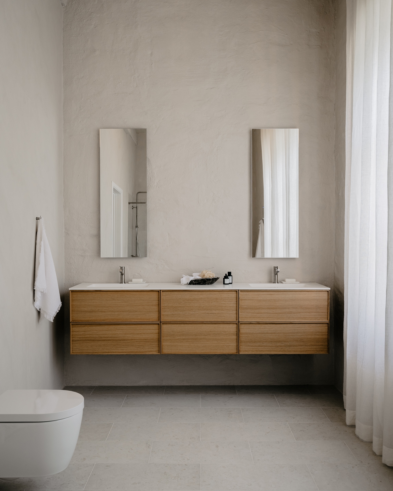 En avstemt palett av varm kalkstein, naturlig eik og metaller med myk finish. For et baderom med diskré luksus og en varig, jordnær karakter.
