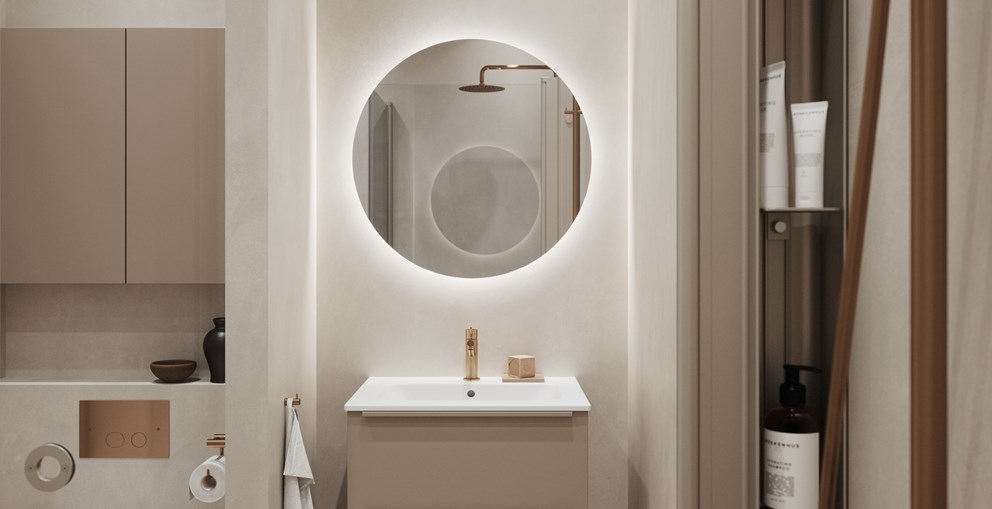 Lite og funksjonelt bad med harmonisk fargeskala i sand, beige og bronse