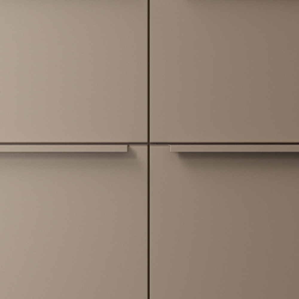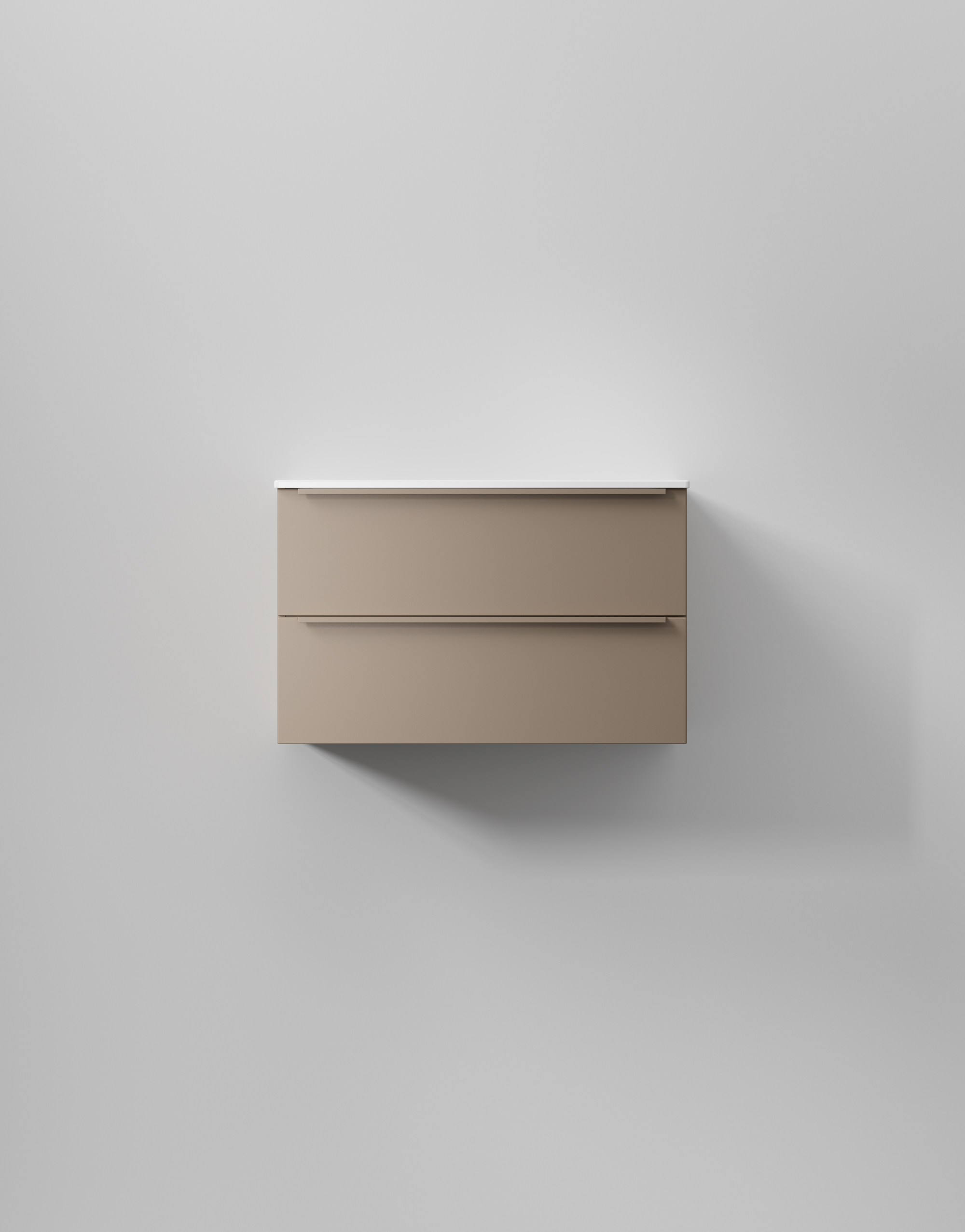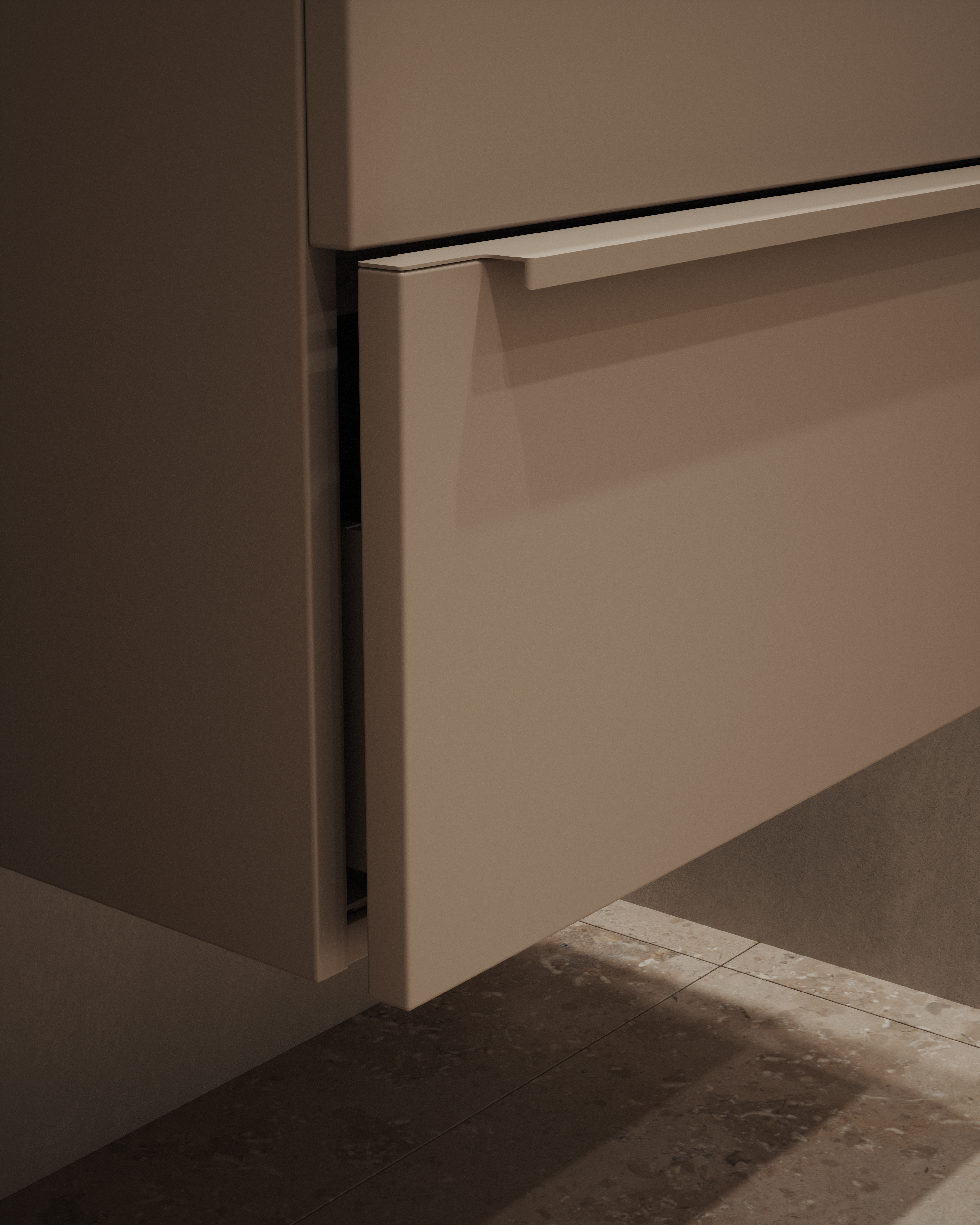 På dette badet har vi brukt nyanser av beige, sand og bronse. Sammen gir de et mykt og balansert uttrykk – med gjennomtenkte dusj- og møbelløsninger som kombinerer oppbevaring og funksjon.