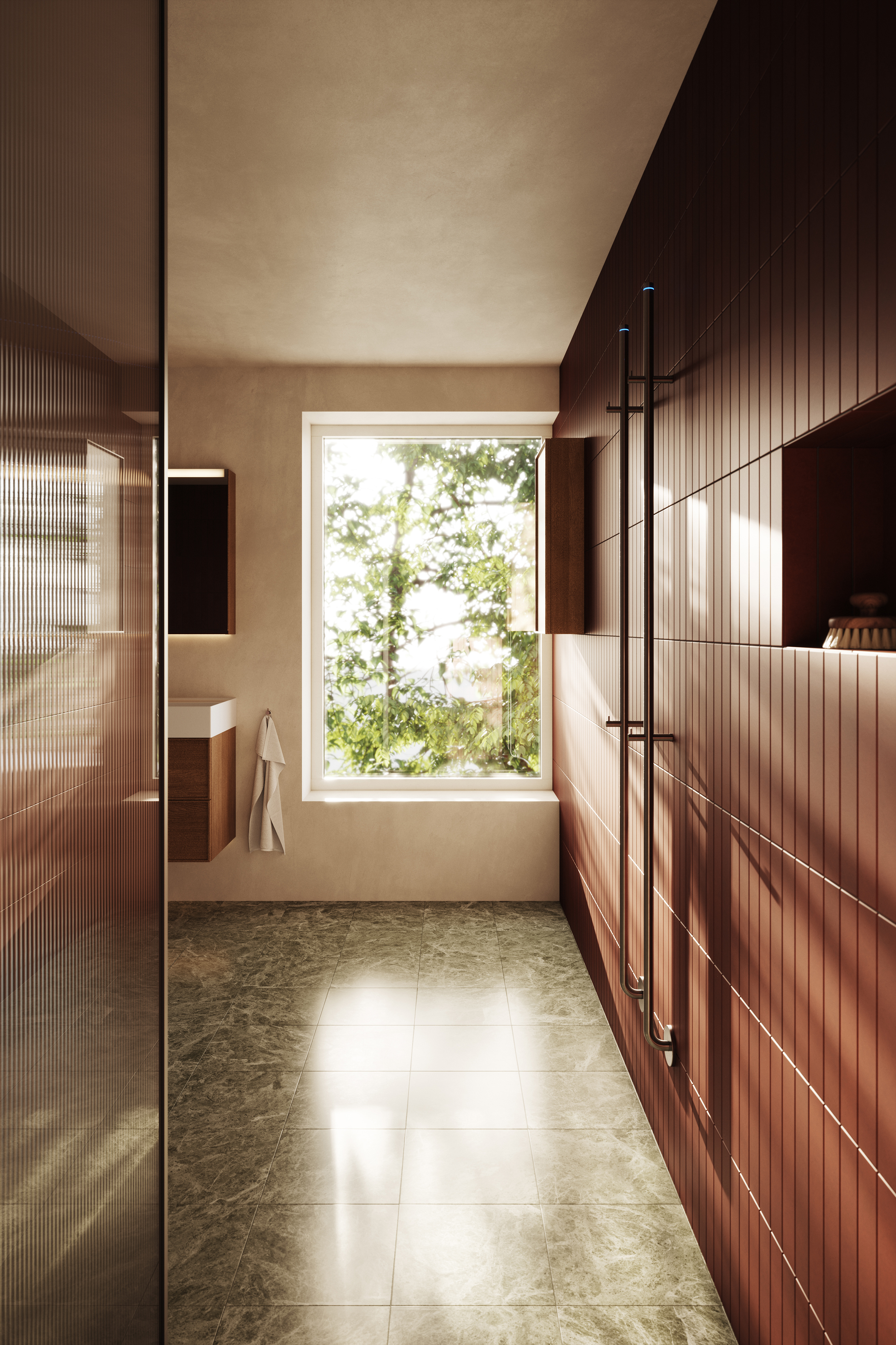 Retrobad i grønn marmor og vinrødt – en ny tolkning av tidløs stil