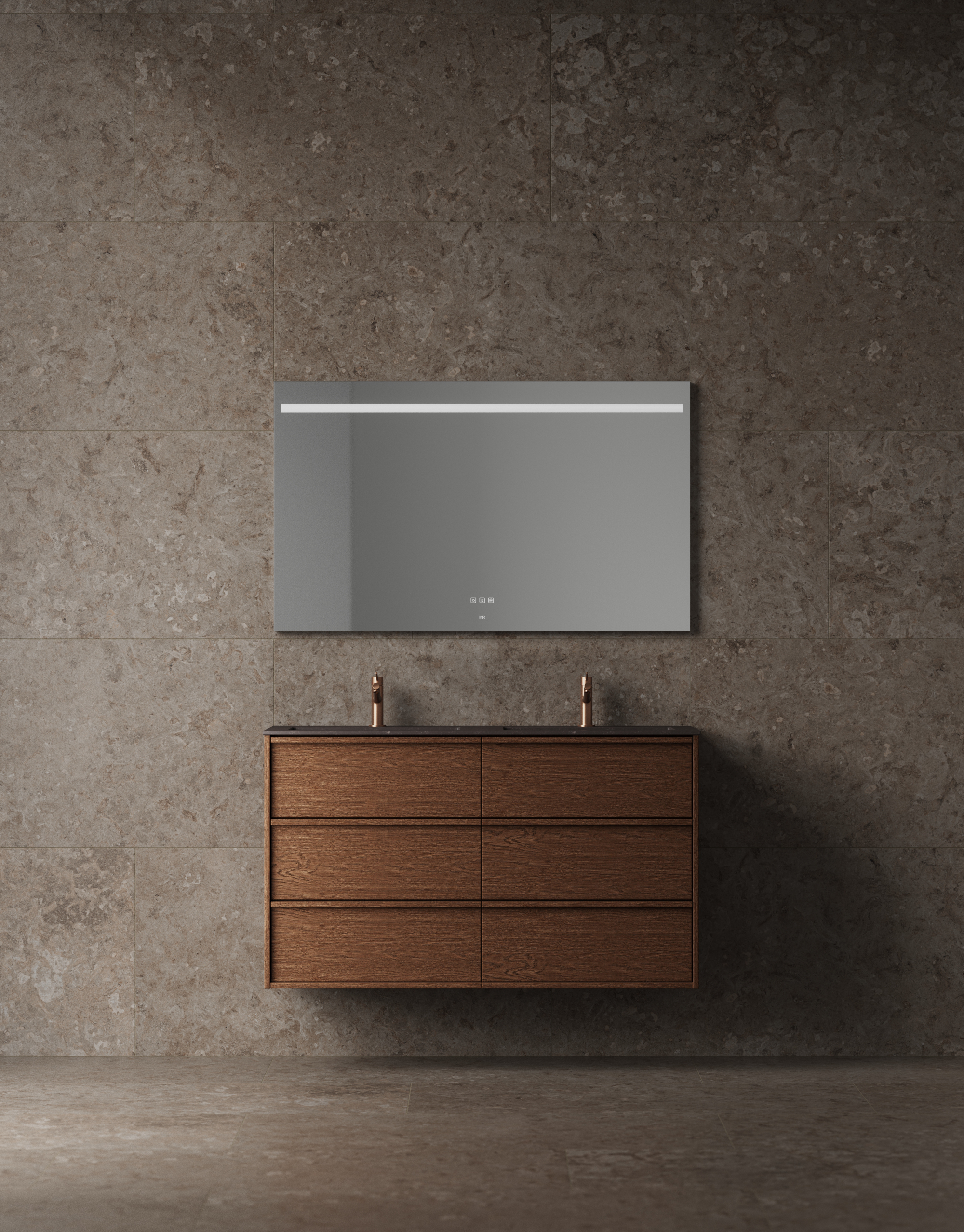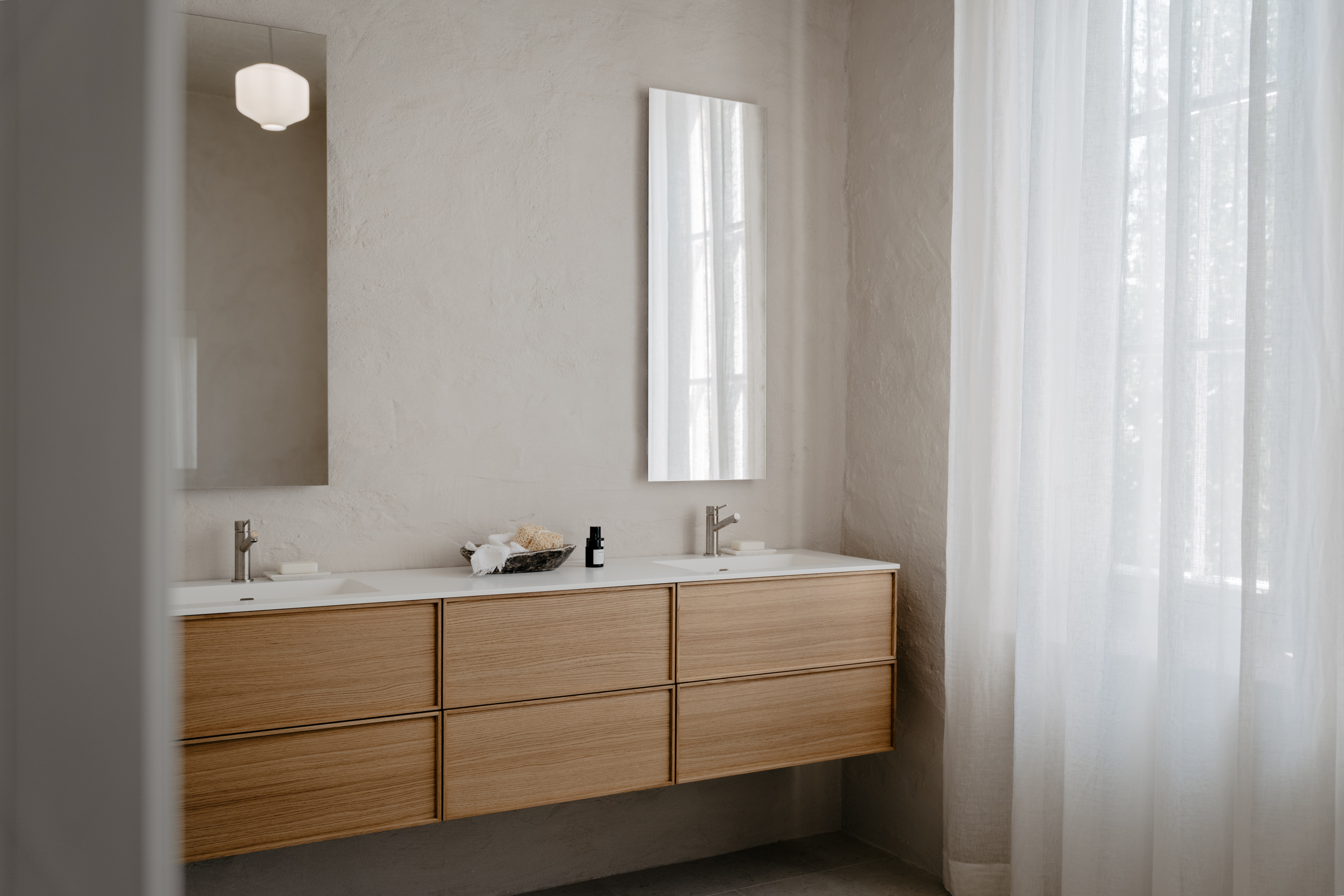 Baderommet beveger seg mot en ny type enkelhet – ikke strippet ned, men rik på materialer, lys og taktile opplevelser. Fokuset flyttes fra dekorasjon til selve materialene; fra det rent visuelle til det sanselige. I årets baderom får de merkbare kvalitetene stadig større betydning – hvordan overflater føles mot fingertuppene, og hvordan lyset beveger seg over stein, tre og glass.