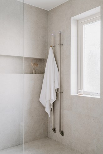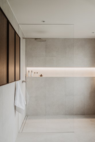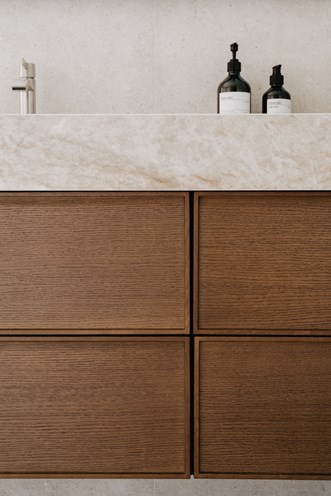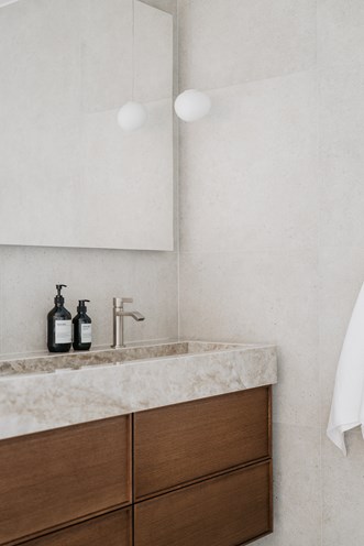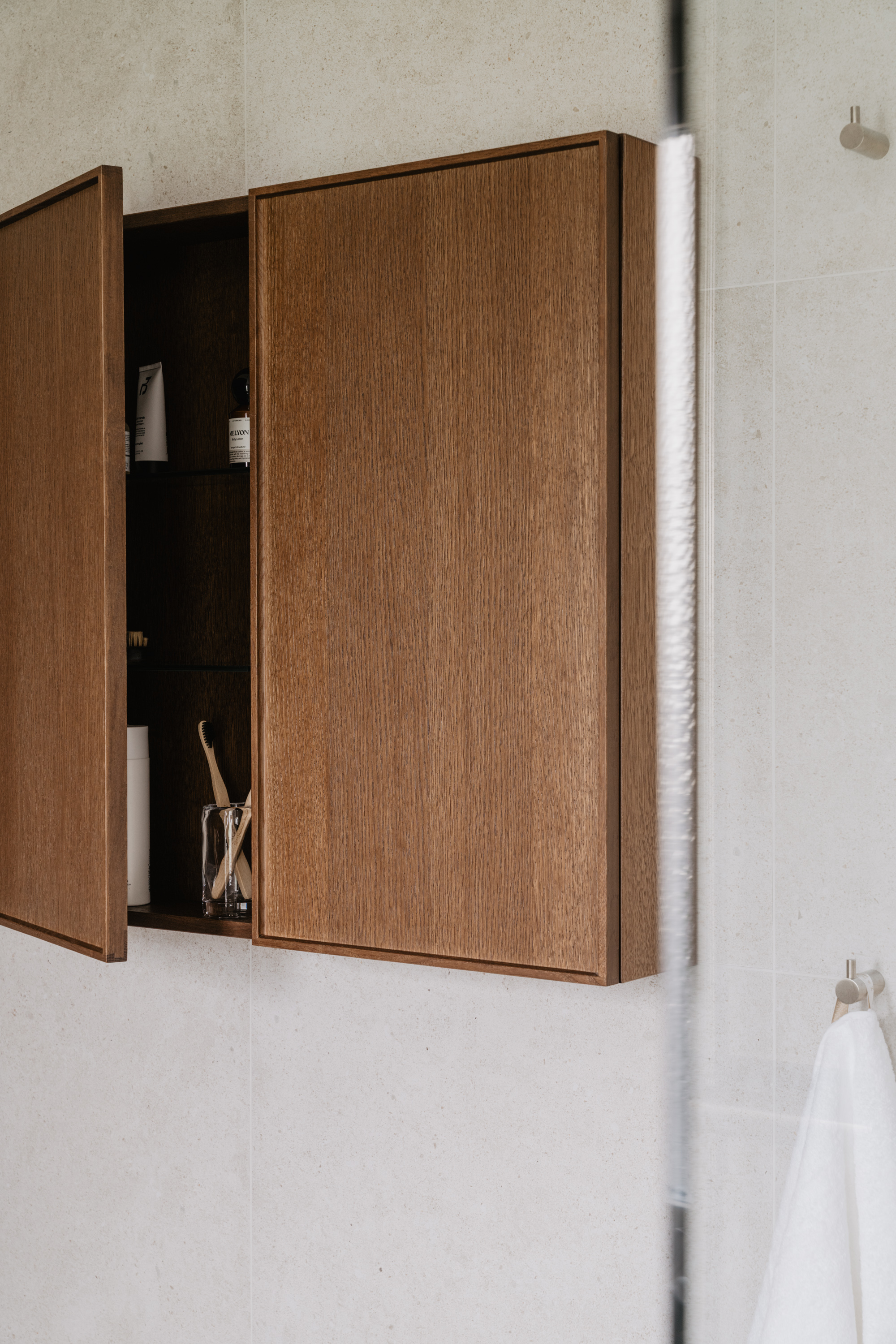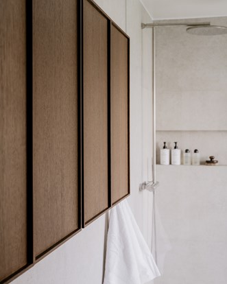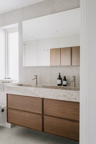 Badet er en viktig del av helheten. Lyse, luftige flater møter beige nyanser og mørke treinnslag som tilfører dybde og kontrast. Resultatet er et tidløst og personlig rom. Les mer om materialvalg, planløsning og detaljene som definerer uttrykket.