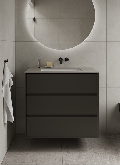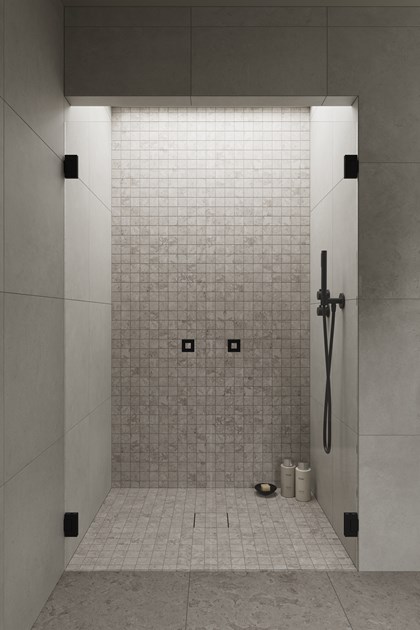 Fog er en palett i monokrom skala – der nyanser av svart og grått skaper et dempet uttrykk med arkitektonisk tilstedeværelse. Veggene kles i Stenvide Fog, en granittkeramikk inspirert av gotlandske kalksteinsformasjoner, med myke variasjoner i lysegrå toner som gir en rolig og tidløs base. På gulv og i dusjen har våre designere valgt Alvaret Ash, en varmgrå granittkeramikk med utgangspunkt i ölandske kalksteinsformasjoner – mer livlig og rå i uttrykket, med naturlige variasjoner og taktil tyngde. Den lyse stenen møter sotede og mørke accenter i innredning og metaller, som tilfører dybde og karakter uten å forstyrre helheten. Resultatet er et baderom preget av nordisk ro, der dramatikken ligger i skyggene og i de nøye utvalgte detaljene.