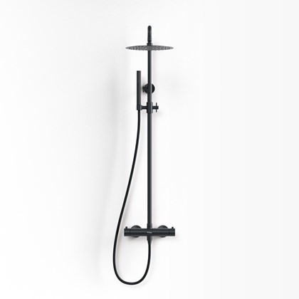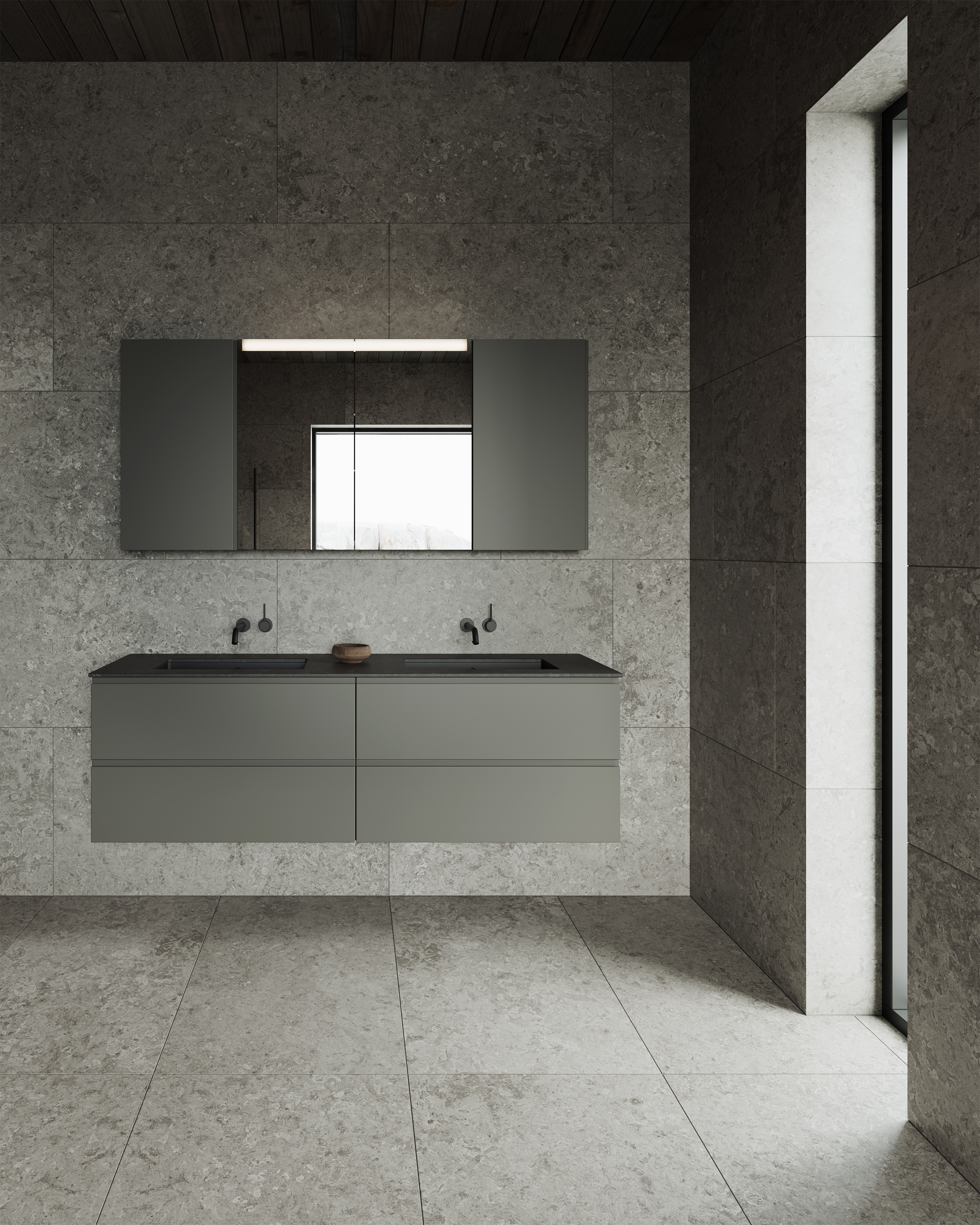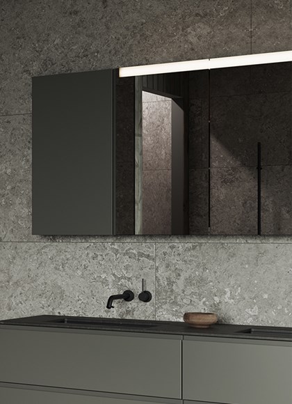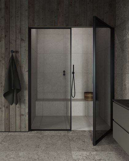 Slate omfavner det mørke, dramatiske og dempede. Her møtes granittkeramikk i dype grå toner, røkfarget glass og mattsvarte metaller i en palett som utstråler nordisk ro med en sofistikert twist Granittkeramikken Alvaret Slate – inspirert av ölandske kalksteinsformasjoner – har et teksturrikt uttrykk med naturlige variasjoner som forsterkes i samspillet mellom lys og skygge. Resultatet er et baderom preget av finstemte kontraster, der hver flate bærer en følelse av både tyngde og avskallet eleganse.