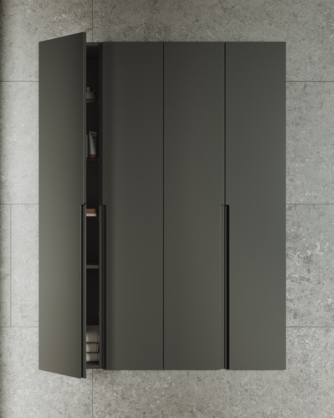 Et grunt, men romslig høyskap med integrert grepslist langs halve dørens langside. Gir godt grep og gjennomtenkt oppbevaring.