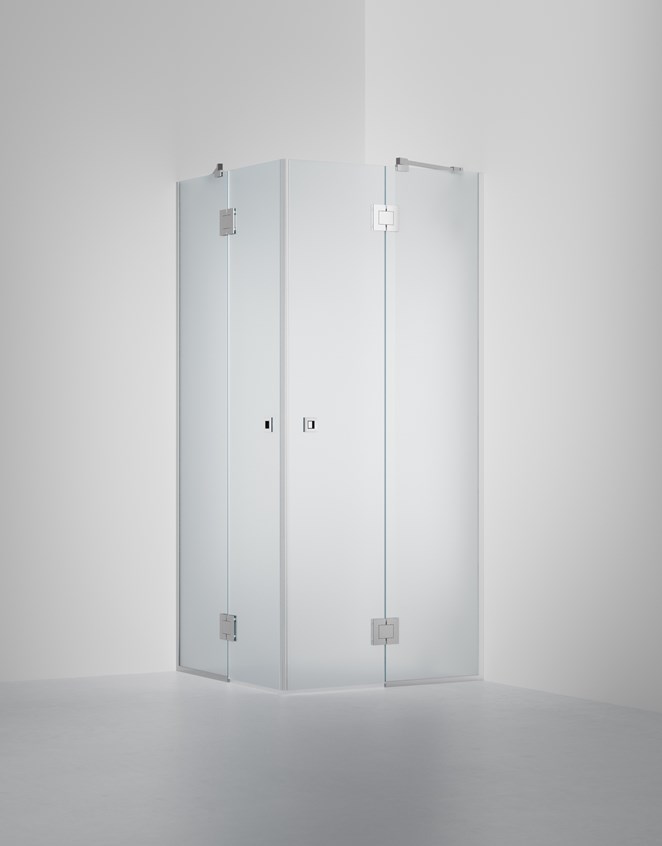 Dusjhjørne med to vegger og to dører i 8 mm glass. Måltilpasses innen angitte intervaller. Tilpasses enkelt etter akkurat dine mål.
