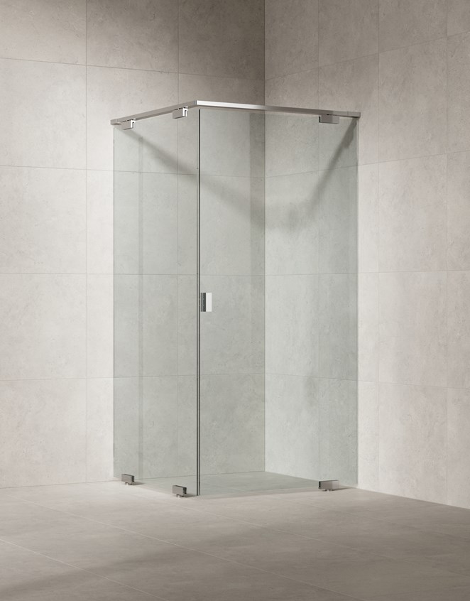 Dusjhjørne med to dører i 6 mm glass og med integrert grep. Finnes i 900x900 mm og i måltilpasset utførelse.