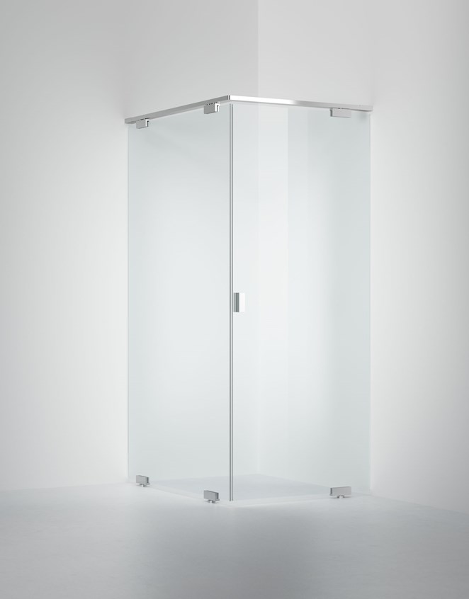 Dusjhjørne med en fast vegg og en dør i 10 mm glass. Døren oppleves nesten svevende når den dreier rundt svingpunket i gulvet. Måltilpasses innen angitte intervaller.