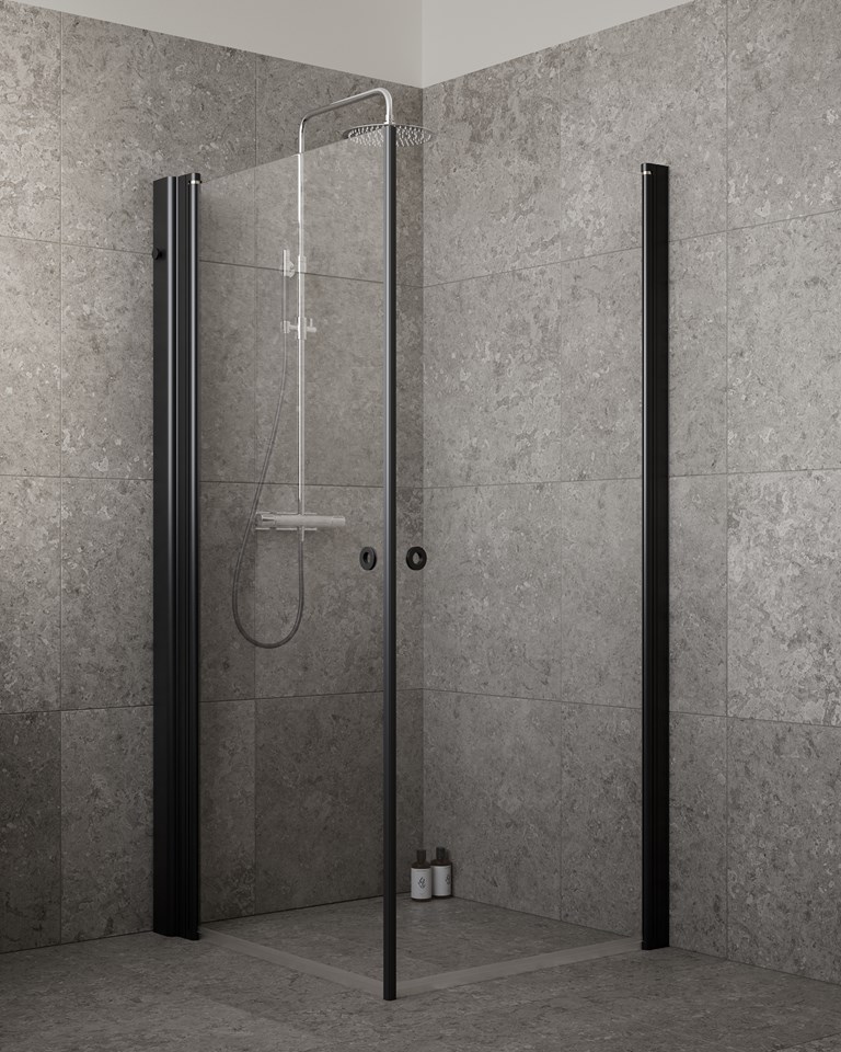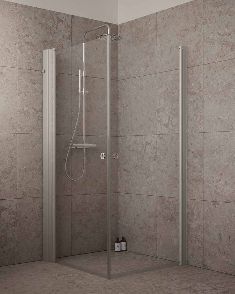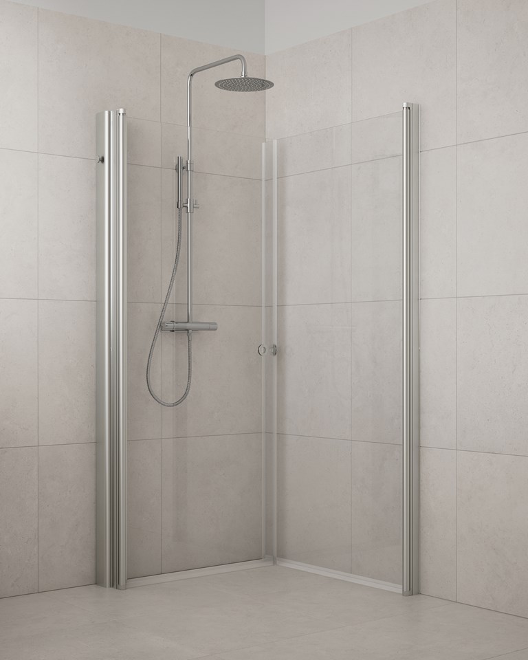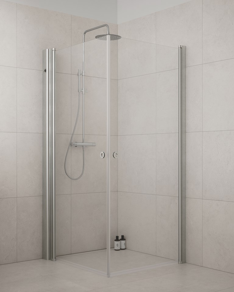 Dusjhjørne med to dører i 6 mm glass og med integrert grep. Finnes i 900x900 mm og i måltilpasset utførelse.