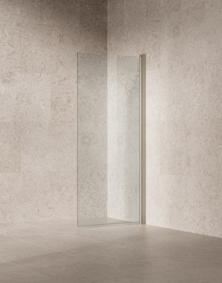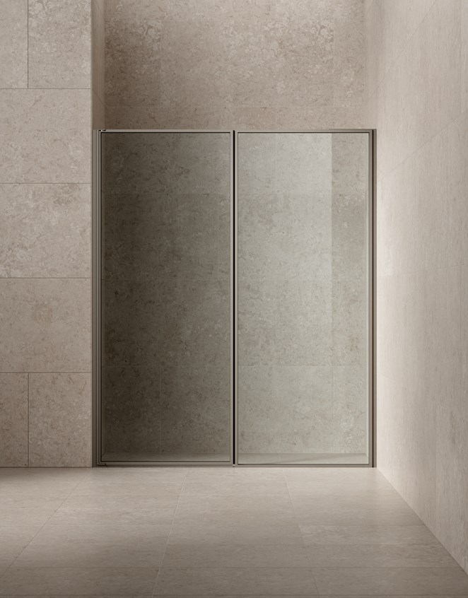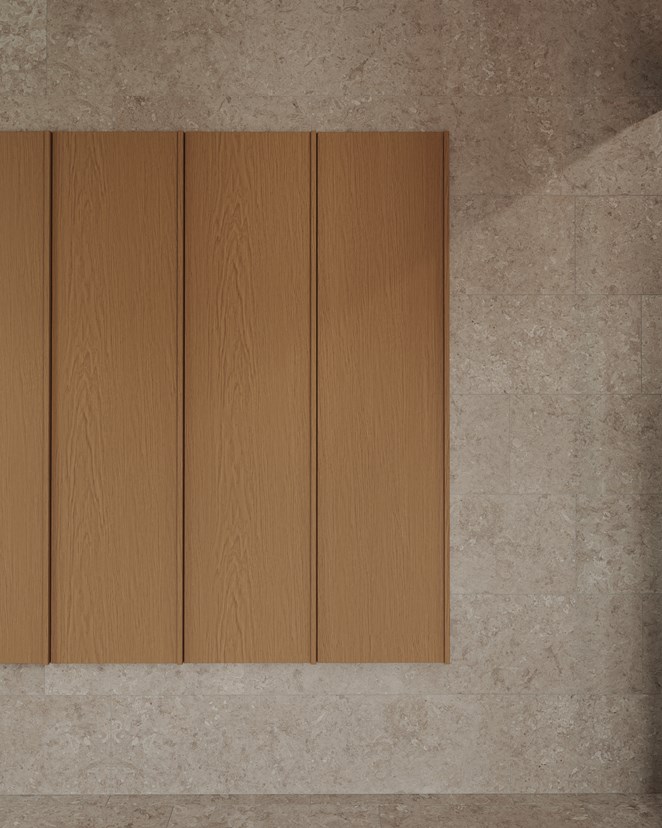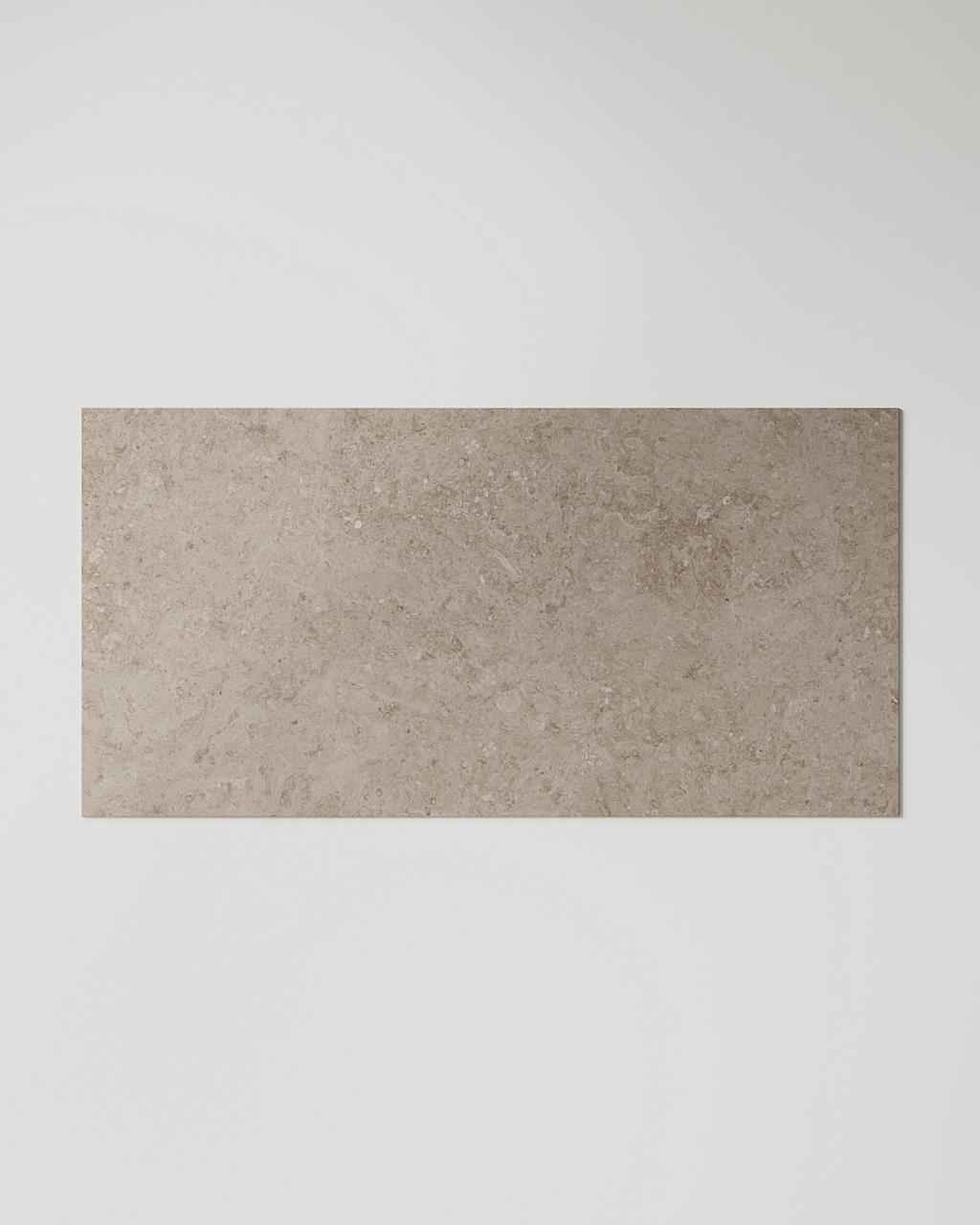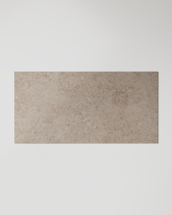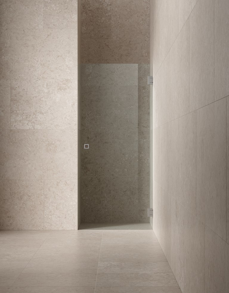 Fliser i lyse beige nyanser inspirert av gotlandsk kalkstein for et baderom i myk harmoni.