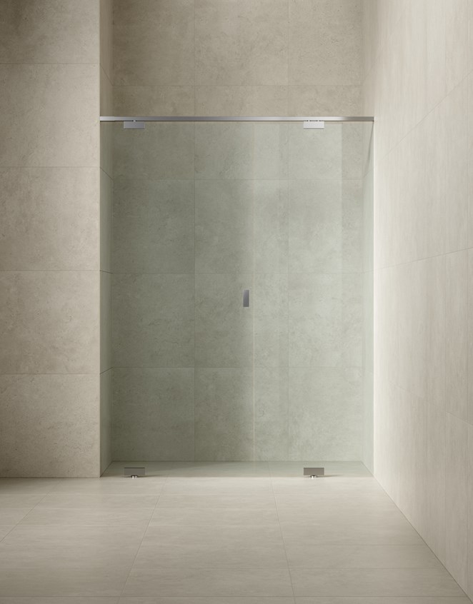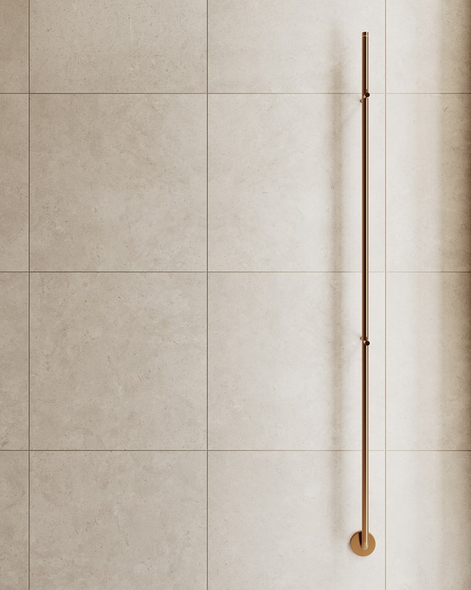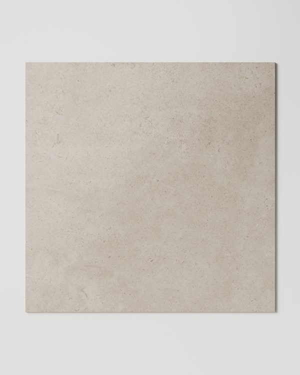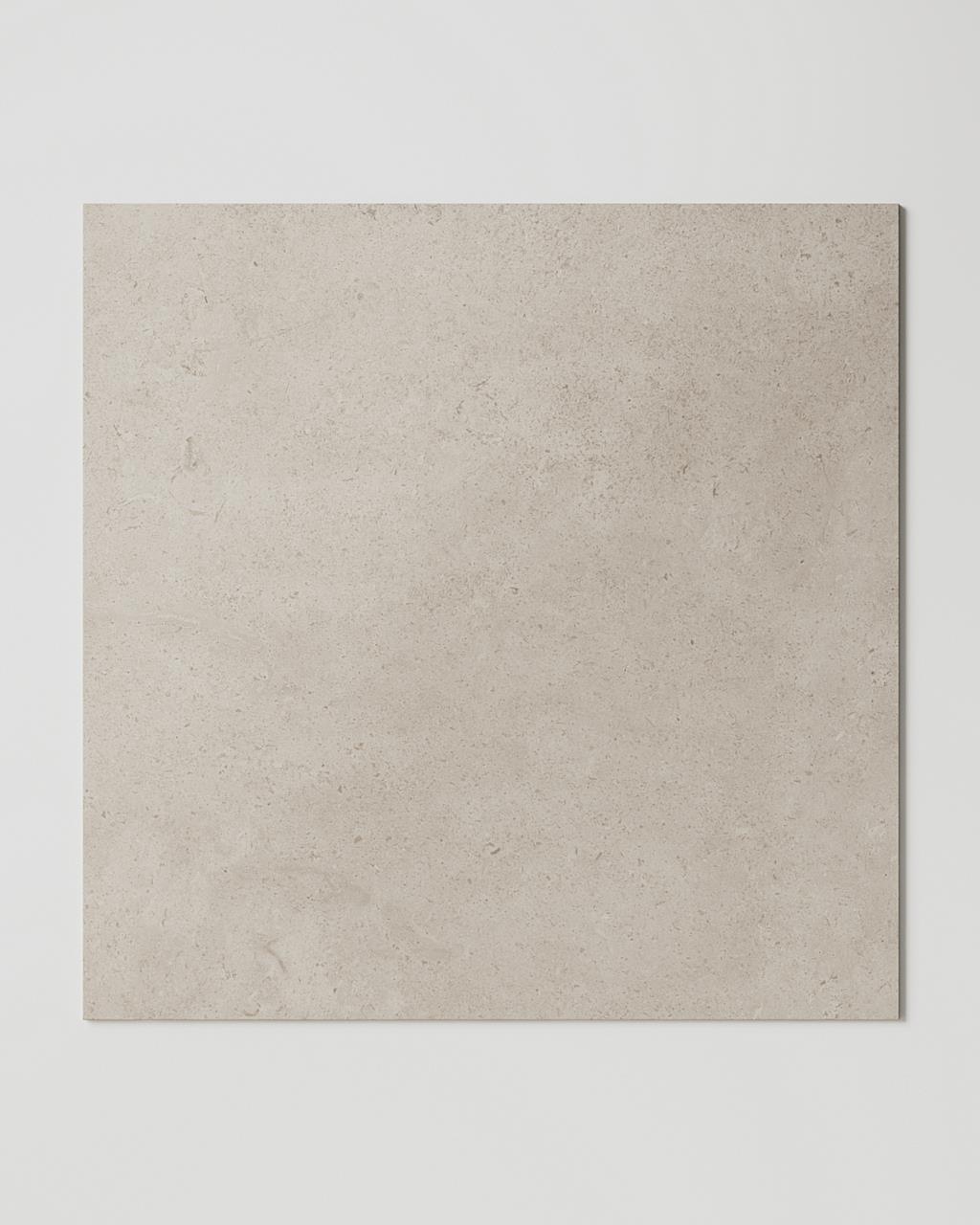 Fliser i lyse beige nyanser inspirert av gotlandsk kalkstein for et baderom i myk harmoni.