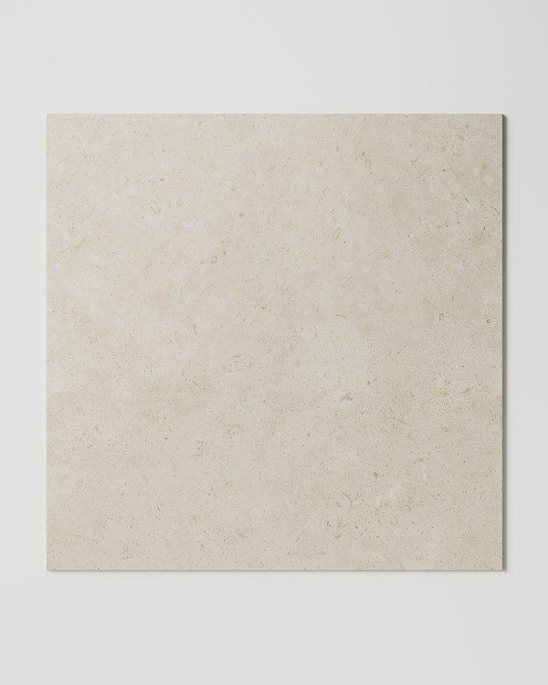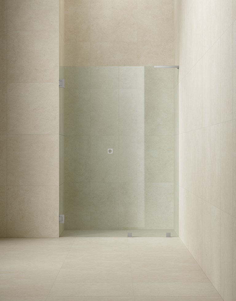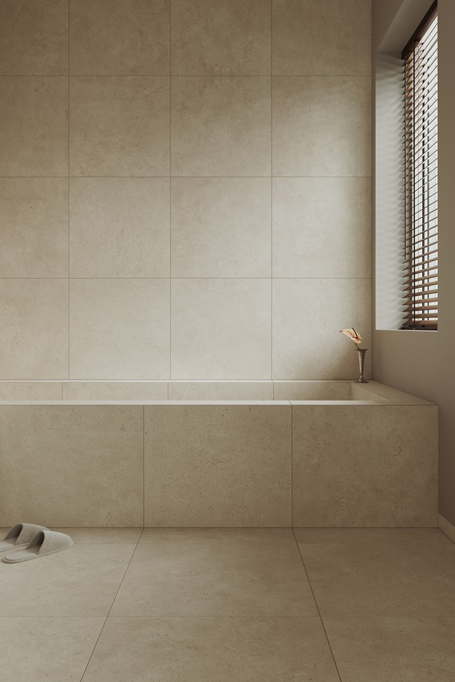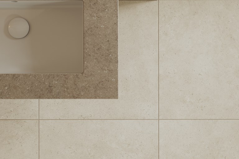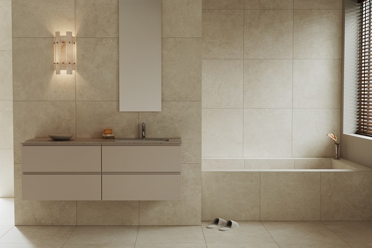 Fliser i lyse beige nyanser inspirert av gotlandsk kalkstein for et baderom i myk harmoni.
