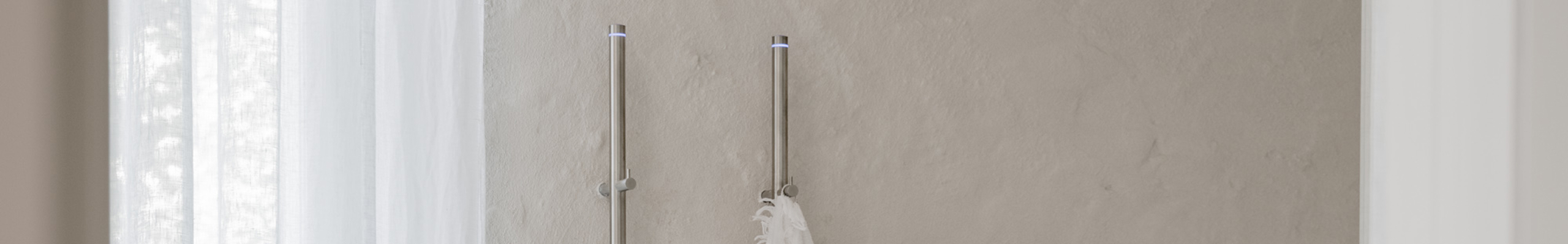 Bli kjent med våre energieffektive elektriske håndkletørkere i to varianter og se hvordan lekkert design og flotte materialer kan gi både varme, lys og stil. Match med håndkleknagger i samme serie.