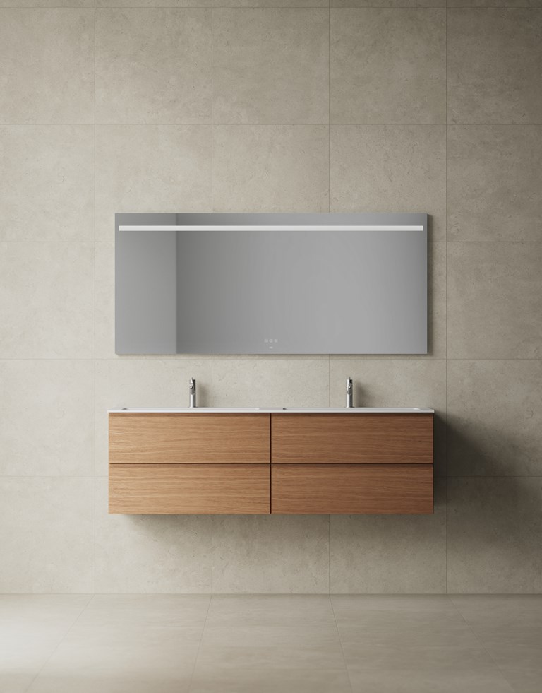 Romslig og topputstyrt speilskap med belysning, berøringspanel, minnefunksjon og dobbelsidige speildører.
