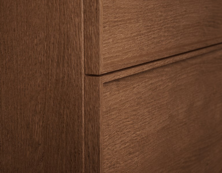 Ekstra grunt servantskap 50 XS med en dybde på kun 390 mm, er en perfekt løsning for små bad der hver centimeter teller. Den tidløse designen med fronten Nema kombinerer en slett overflate og elegant ramme med skjulte grep for smidig bruk. Velg finér for en moderne retrostil eller en NCS-farge for å sette ditt personlige preg. Servant i porselen, skuffer med soft-close, antisklimatter og TX Top Extreme™ overflatebehandling sikrer langvarig kvalitet og funksjonalitet til det mindre badet.