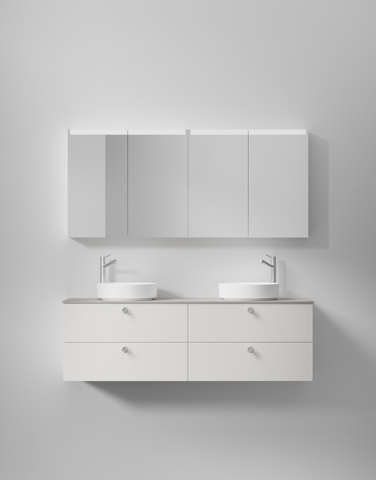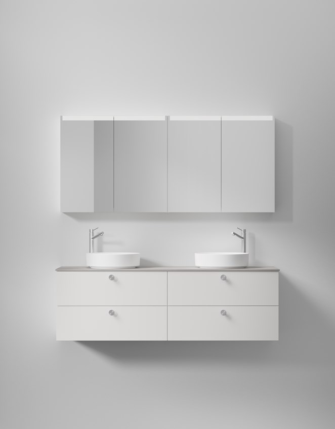 Solid 160 D er et ideelt valg for den store familien, komplett med doble servanter. Velg mellom to ulike løsninger: en servant med to kummer eller en benkeplate med to runde toppmonterte servanter. Begge alternativene er produsert i solid surface – et slitesterkt materiale i matt utførelse som gir en behagelig, varm følelse. De slette frontene har en tidløs design som passer de fleste interiørstiler. Tilpass servantskapet etter dine behov med ulike åpningsalternativer, for eksempel push, og kompletter med smarte tilvalg som sensorstyrt belysning og dobbel stikkontakt.