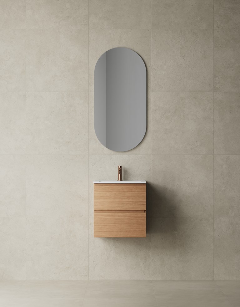 Speilskap med delt rundt speil og lysrefulering via touchpanel.