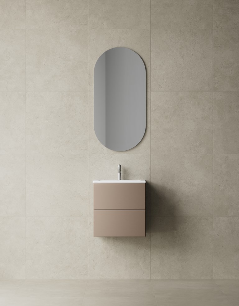 Stilrent formspråk med slett front, et praktisk servantskap for små bad.