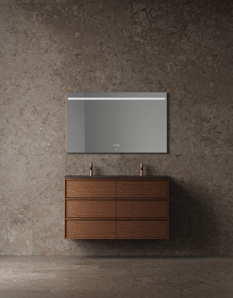 Terra Carve 120 D lar treverket stå i sentrum, med finér med større trestruktur enn i våre øvrige serier – noe som skaper et nyansert og taktilt samspill av farger og teksturer. Det integrerte grepet forsterker uttrykket og gir møbelet en balanse mellom det dristige og det harmoniske. Med en skroghøyde på 70 cm og seks fullt uttrekkbare skuffer er det god plass til hele familiens baderomsvaner – ryddig organisert og alltid lett tilgjengelig. Med dobbel servant blir møbelet et naturlig samlingspunkt på badet, både praktisk og elegant. Velg porselenservanten Shape eller det ultramatte, porefrie alternativet Smooth i solid surface. Ønsker du et mer personlig uttrykk, kan du kombinere benkeplate i solid surface eller mineralkompositt med toppmontert servant Soak eller underlimt modell Wave. Benkeplaten kan leveres med eller uten hull for blandebatteri (med hull er standard) – et valg du enkelt gjør i Studio.