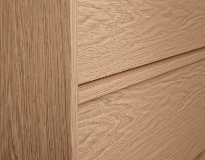 Sjenerøst høyskap i finér med to skuffer og gjennomgående grepslist i massiv eik langs hele dørens langside. Tilfører varm trefølelse, tydelig karakter og maksimal oppbevaring.