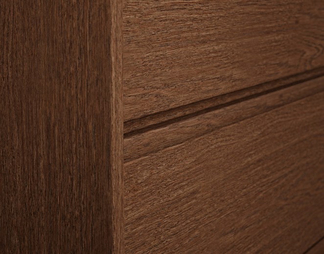 Terra Grip 60 kombinerer en slett front med en diskré grepslist som løper langs hele skuffen og gir et sofistikert uttrykk. Finéren har en mer markert og uttrykksfull trestruktur enn i våre øvrige serier – noe som gir møbelet en varm og naturlig karakter som endrer seg med lyset. Dette er et servantskap med egen identitet - Terra Grip 60 tar sin plass og blir det naturlige midtpunktet på badet. Ønsker du et mer nedtonet uttrykk, finnes Terra Grip også i Pure White eller valgfri NCS-farge. Til tross for sin størrelse rommer møbelet tre fullt uttrekkbare skuffer og har en skroghøyde på hele 70 cm – noe som gir en oppbevaringskapasitet man vanligvis forbinder med langt større møbler. Formspråket er nøye gjennomtenkt ned til minste detalj – bygget på solid håndverk og skandinavisk designarv. Alle overflater er behandlet med TX Top Extreme™ som beskytter mot fukt og slitasje i minst 15 år.