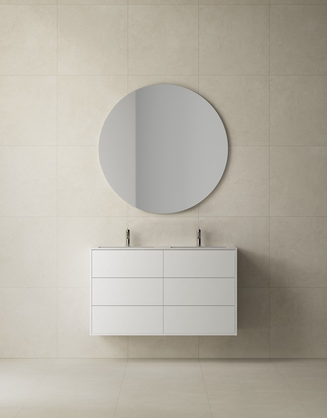 Med dobbel servant og seks fullt uttrekkbare skuffer er Terra Solid 120D baderomsmøbelet som gjør hverdagen enklere for hele familien. Her er det rikelig med plass – og rom for å være flere foran speilet samtidig. Møbelet tar plass, både fysisk og visuelt, og blir et naturlig midtpunkt på badet. Det høye skroget på 70 cm og de seks skuffene gir maksimal oppbevaring – uten å gå på kompromiss med uttrykket. Den slette fronten skaper en harmonisk helhet, mens materialvalgene tilfører varme og karakter. Servantskapet har en mer uttrykksfull finér i form av større trestruktur enn i øvrige serier – en levende finér som forsterker følelsen av skandinavisk håndverk. For et mer nedtonet uttrykk kan du velge Pure White eller valgfri NCS-farge. Formspråket er rent og tydelig, mens detaljene vitner om gjennomført håndverk designet for å vare. Alle overflater er behandlet med TX Top Extreme™ for å tåle fukt og slitasje i minst 15 år.