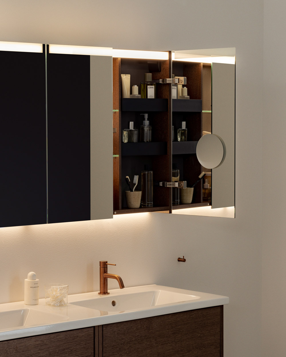 Våre speilskap med LED-belysning finnes i flere varianter – både som speilskap med innfelt belysning og speilskap med overbelysning. I vårt brede sortiment av speil og speilskap finner du også trendy runde speil og runde speilskap. Begge alternativene gir baderommet et moderne og vakkert uttrykk, både dag og natt. Hvilket av våre speil og speilskap velger du?