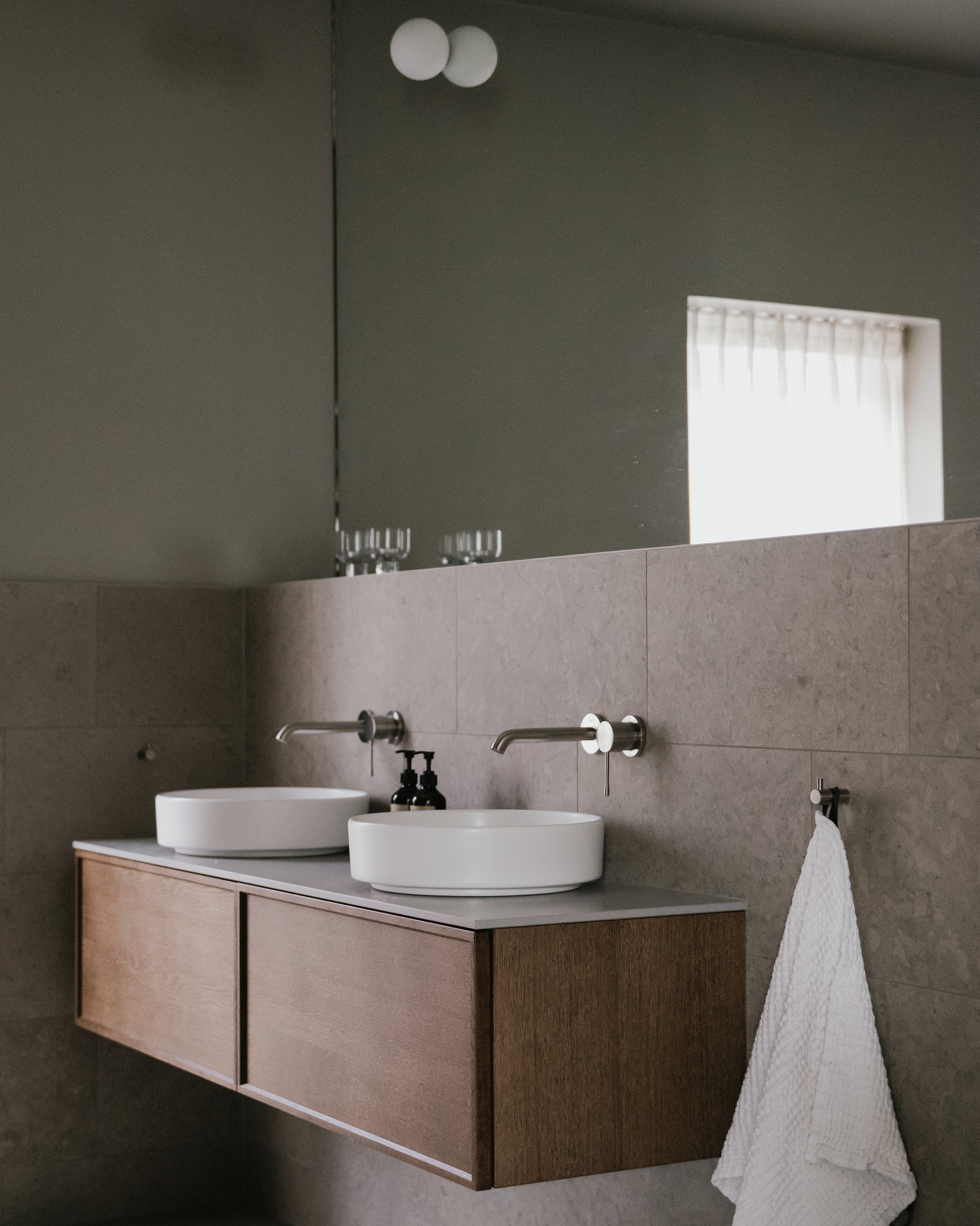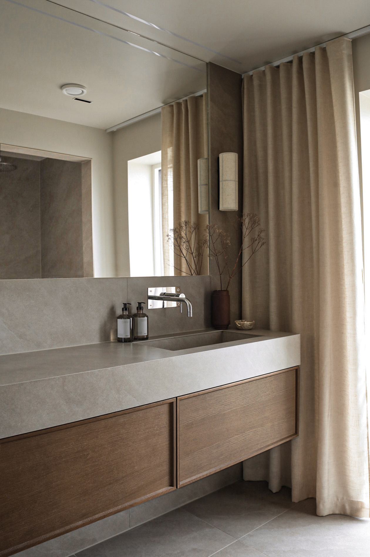Air Wood 160 i Dark Oak med benkeplate i Raw Concrete.