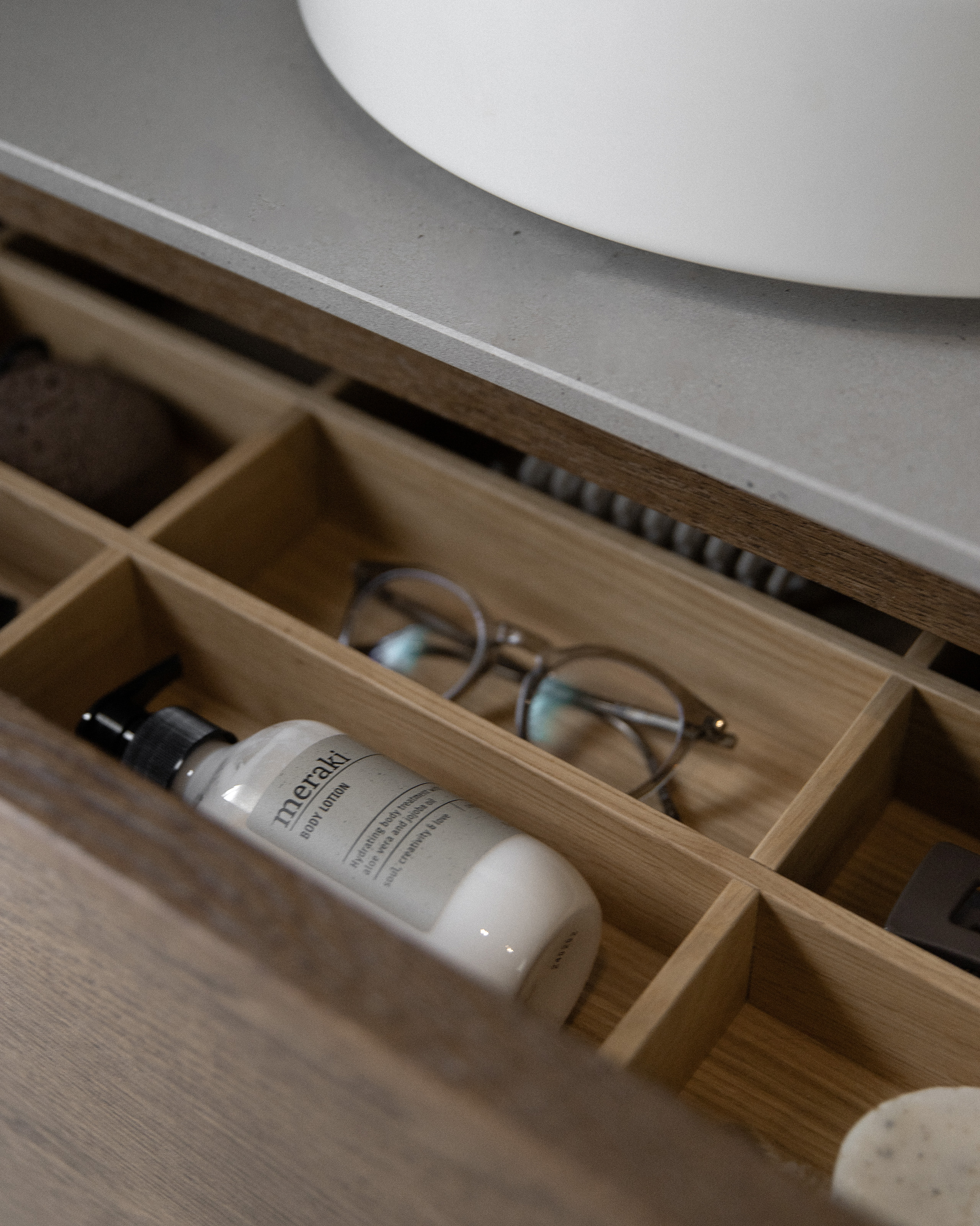 Den rominndelte innvendige skuffen i massiv eik.